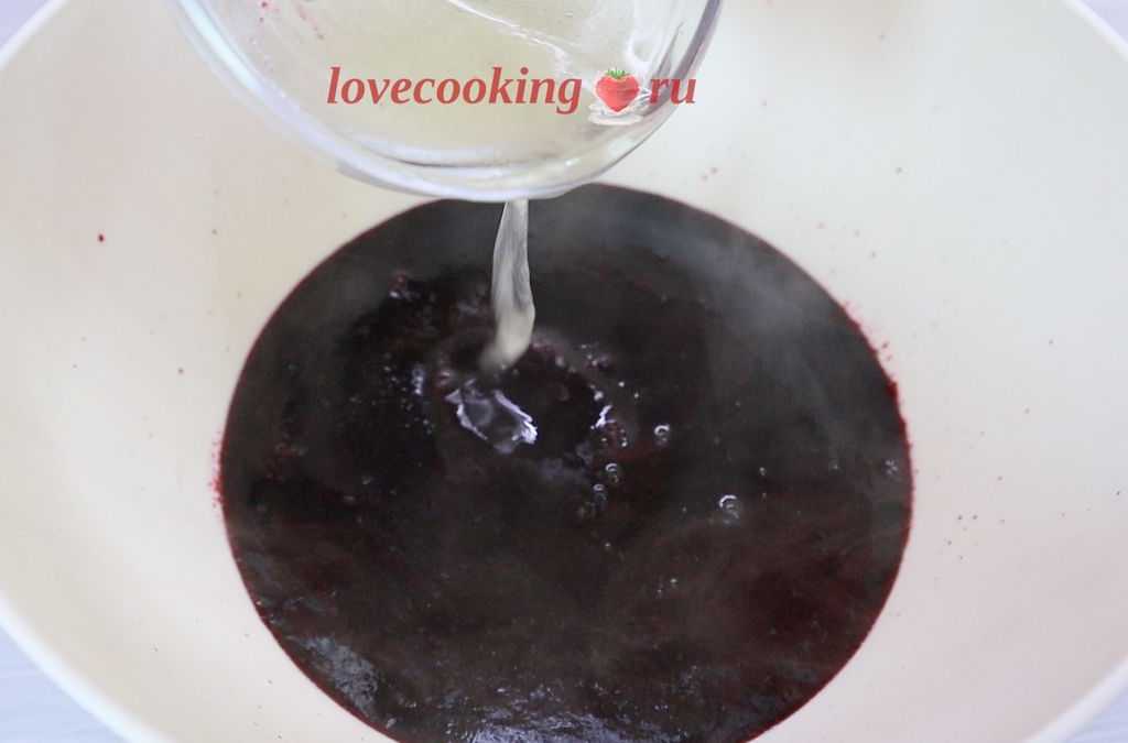 Для этого с помощью блендера делаем из черники пюре. Желатин замачиваем на 10 минут в 100 миллилитрах холодной воды. После его набухания ставим его на плиту и разогреваем на маленьком огне, не доводя до кипения. Добавляем получившееся черничное пюре, перемешиваем. Убираем с плиты и оставляем остывать.