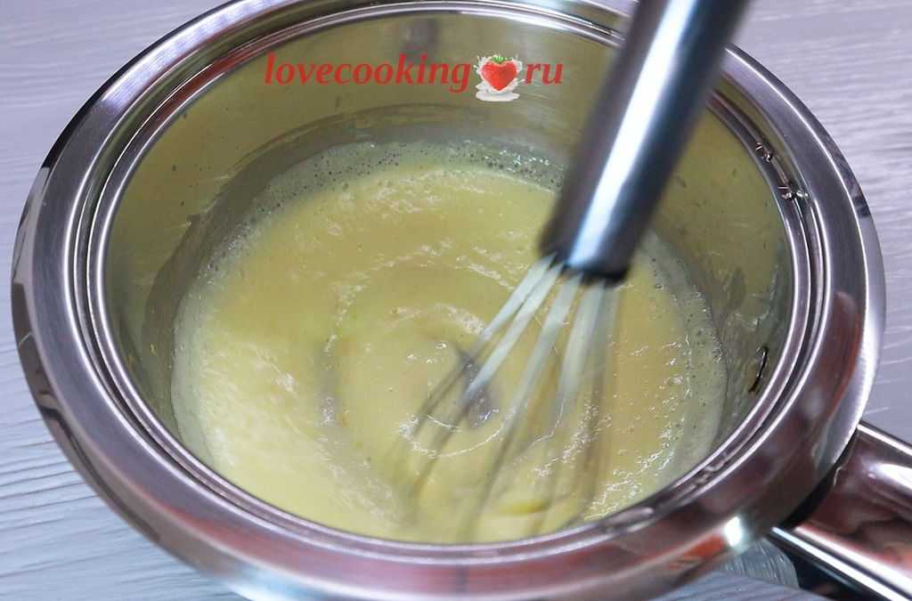 Ставим сотейник на медленный огонь. Завариваем крем до лёгкого загустения, постоянно перемешивая.