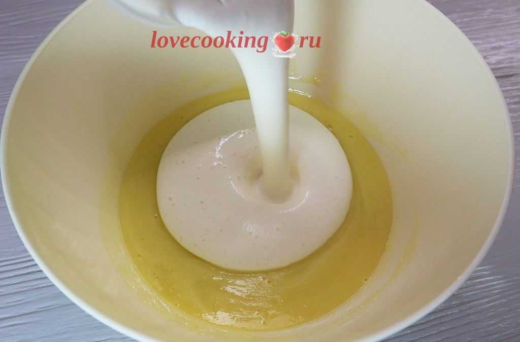 Растопленное сливочное масло и тёплое молоко добавляем в тесто. Перемешиваем венчиком.