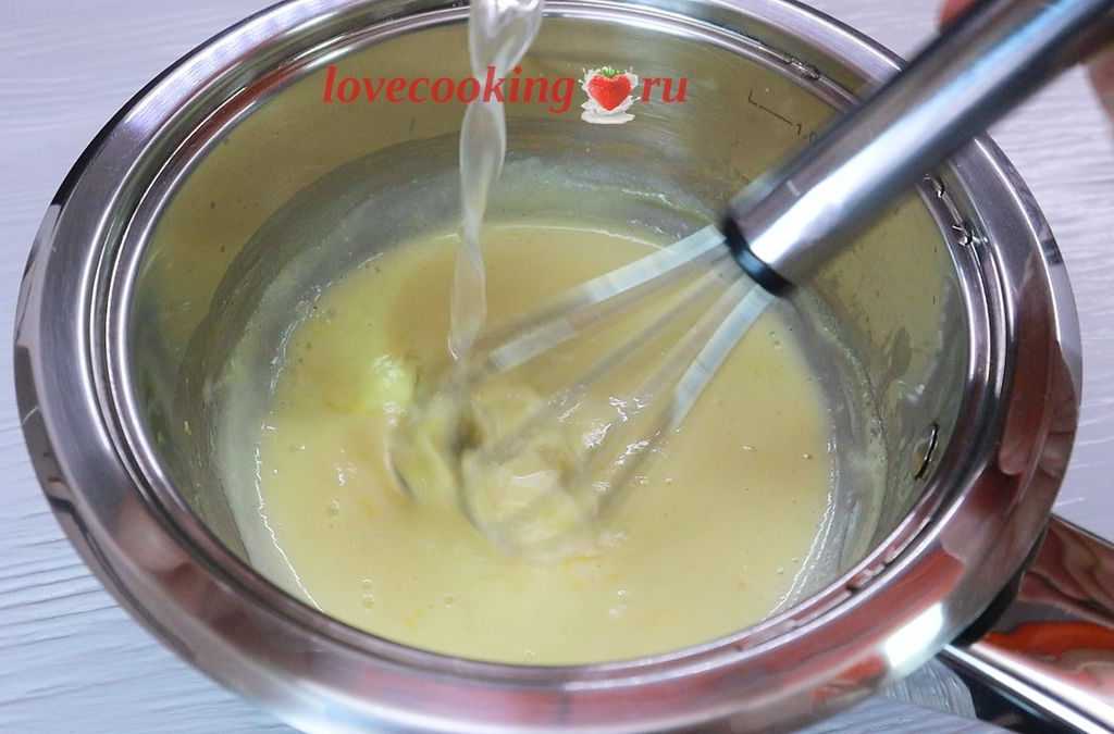 В сотейнике соединяем яичные желтки, сахар, ванилин, лимонную цедру. Хорошо перетираем венчиком.
