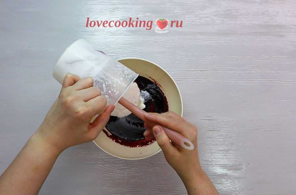 Соединяем в отдельной посуде сметану с ванилином и медом. Взбиваем. Выливаем к сметане получившуюся черничную массу. Теперь можно переходить к формированию торта.