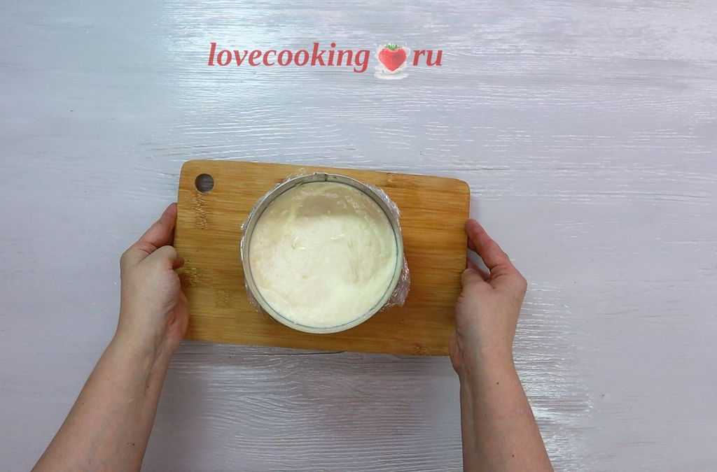 Помещаем заготовку в кольцо 14 см. Дно хорошо затягиваем пищевой плёнкой. Стенки формы можете застелить ацетатной плёнкой или тефлоновым ковриком.