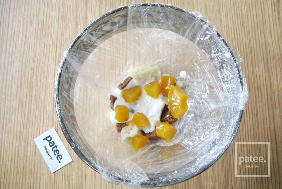 - Глубокую тарелку застелить пищевой пленкой. Чтобы она плотно прилегала к стенкам посуды, потребуется промазать ее 1 ст. ложкой сладкого крема.