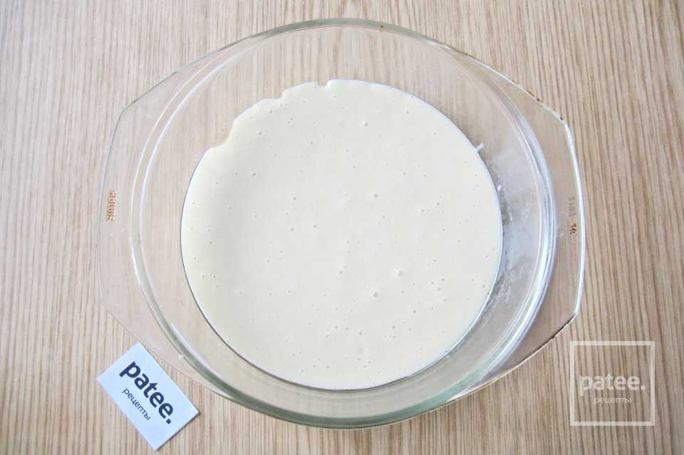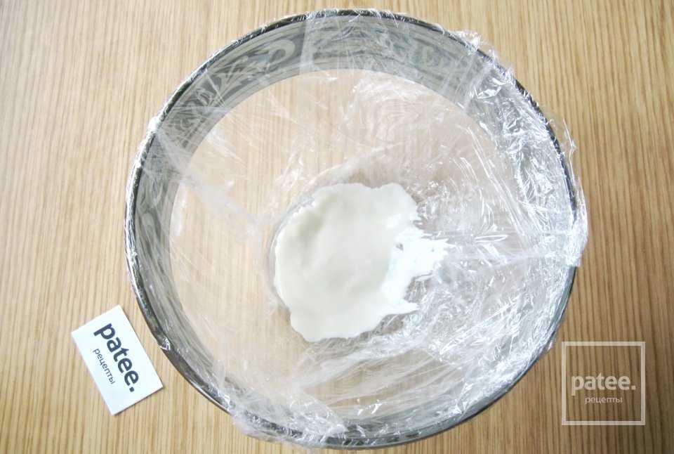 - Подготовить глубокую емкость для сборки торта. Выложить на нее пищевую пленку и обильно смазать края сметаной с сахаром. После этого пленка должна плотно прилегать к тарелке.
