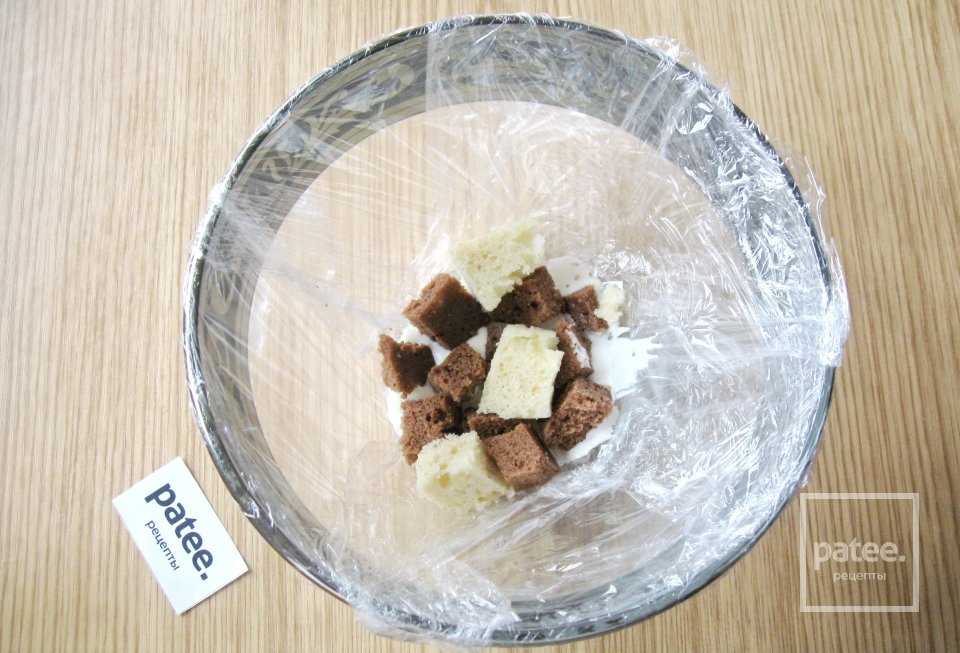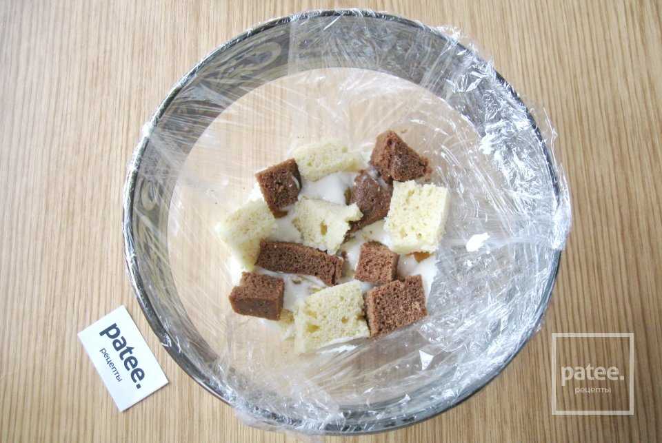 - Разрезаем бисквит на коржи, откладываем самый нижний для торта, а остальные нарезаем на кубики;