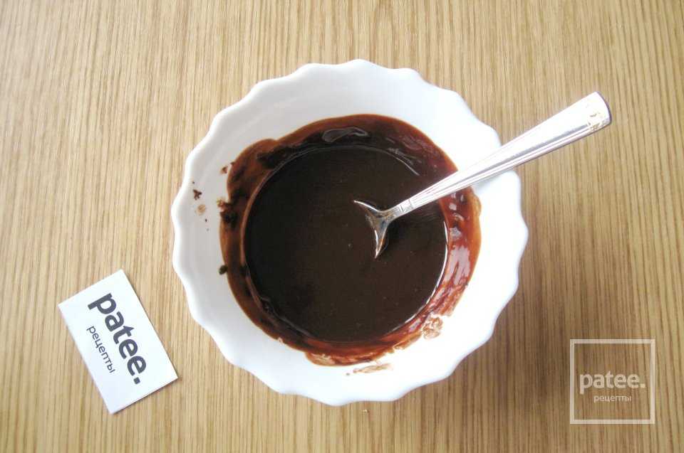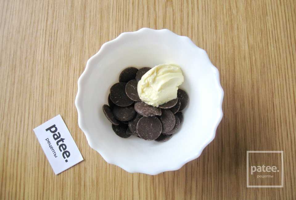 Приготовьте ганаш. Кусочки темного шоколада положите в маленькую кастрюльку, добавьте ложку сливочного масла и нагрейте массу на медленном огне. Как только ганаш растает, перемешайте его и немного остудите.