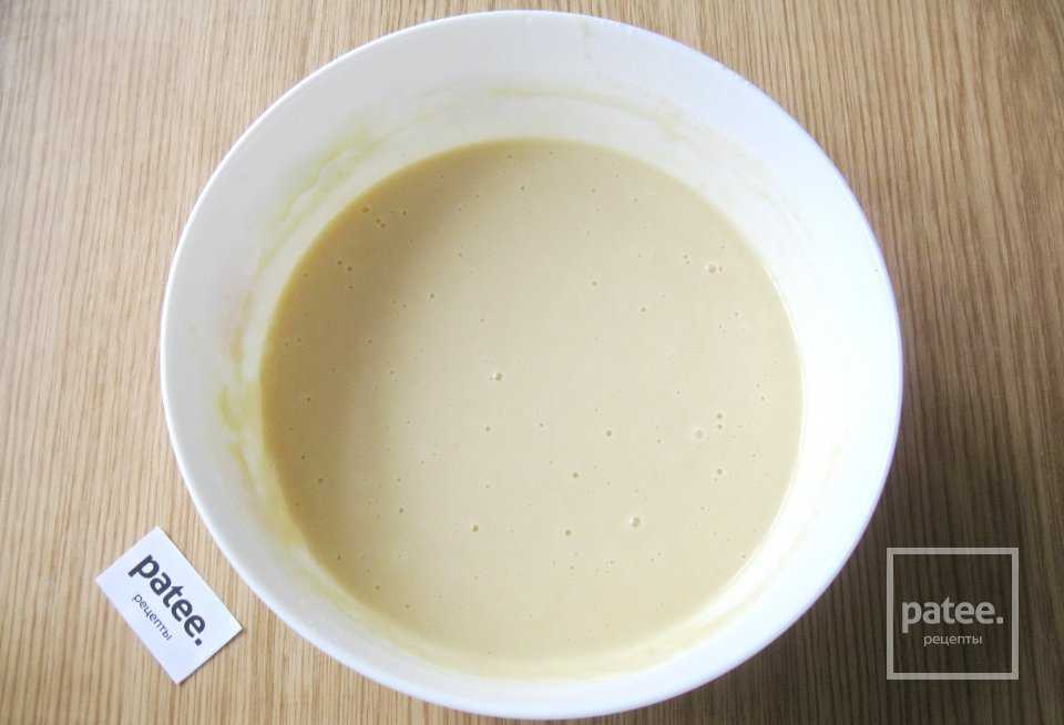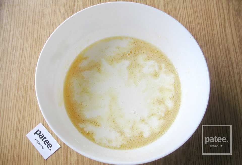 - В отдельной емкости соединить яйца и сахарный песок. Взбивать следует до тех пор, пока объем не увеличится примерно в три раза. Перелить в сливочно-молочную смесь.
