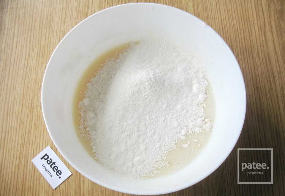 - Просеять разрыхлитель и муку. Добавить сыпучие продукты в общую массу и вымешивать, делая движения снизу вверх.