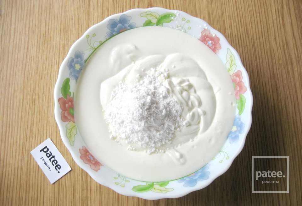 - Чтобы приготовить крем, следует смешать сметану и сахарную пудру, после добавить сливки и взбить до образования пиков.