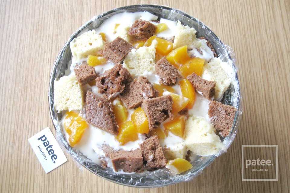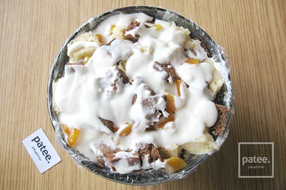 Белый корж кладем на блюдо, смазываем кремом, посыпаем начинкой. Черный корж ломаем на кусочки и обмакиваем в крем. Укладываем на нижний корж. Сверху тоже посыпаем начинкой.