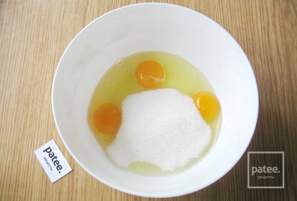 Взбейте яйца миксером, до появления пены, а затем начинайте подсыпать небольшими порциями сахар. Продолжайте взбивать до тех пор, пока сахар полностью не растворится. На эту процедуру уходит около 10 минут. Яичная масса должна увеличиться в объёме раза в три и побелеть.