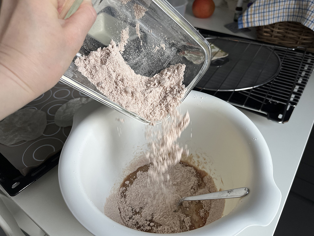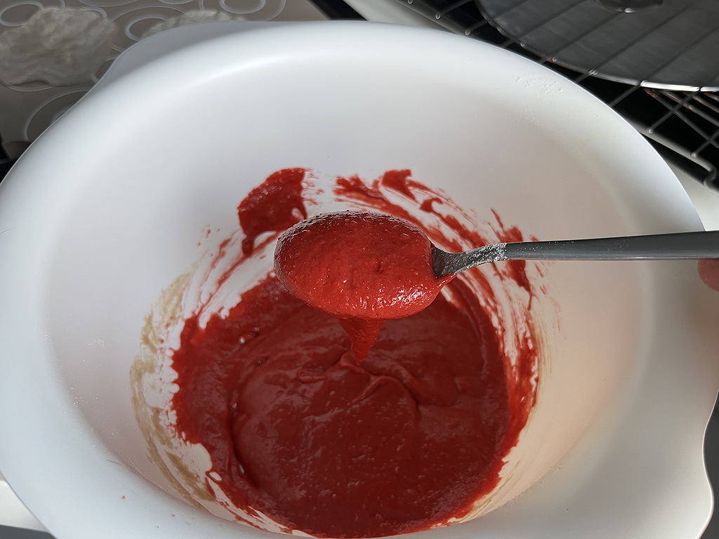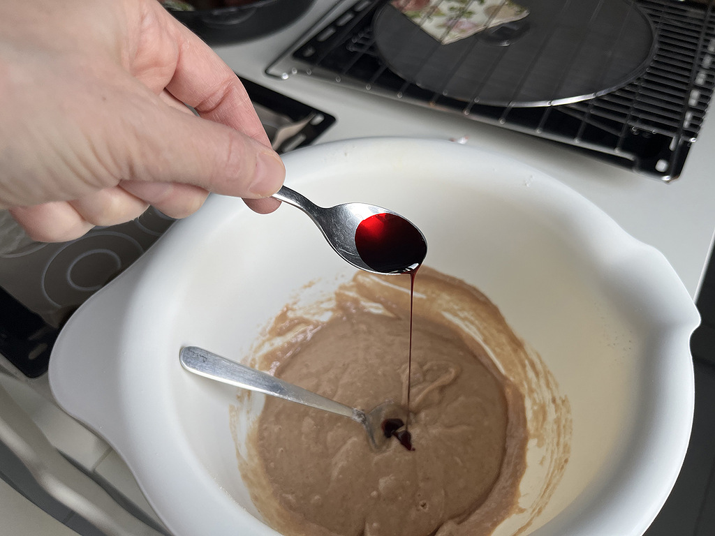 Я сначала влила 1/2 ч.л. красителя, потом увидела, что этого количества недостаточно — я планировала коржи глубокого бордово-красного цвета — и добавила ещё 1/2 ч.л. красителя.