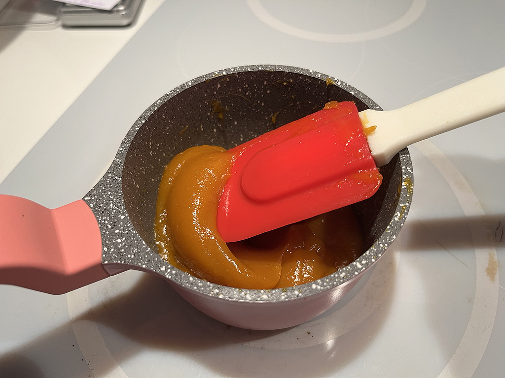 Дать персиковой массе полностью остыть при комнатной температуре, затем поставить в холодильник на 3 часа и более.