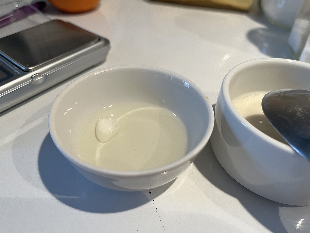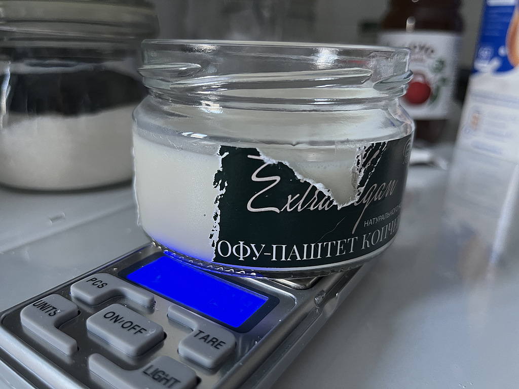 - 130 г овсяного молока “Овсяша” комнатной температуры (жирность любая) — отмерить можно в баночке (200 г) из-под тофу-пасты Casa Kubana или паштета Extra Vegan: овсяное молоко должно почти доходить до начала сгиба, ведущего к резьбе на горлышке у баночки (см. фото),