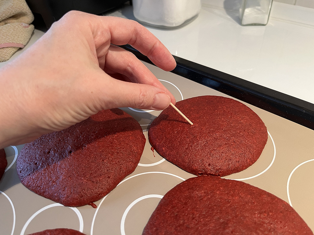 Поставить в разогретую духовку выпекаться на 15-16 минут. Готовность теста проверить зубочисткой: воткнуть зубочистку в бисквит и вынуть, если кончик зубочистки сухой — бисквиты готовы.