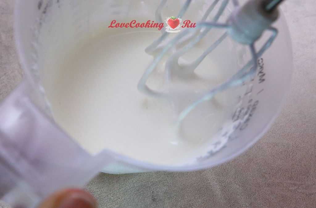 - Далее смешиваем сливки с сахаром и взбиваем до образования пышной массы.