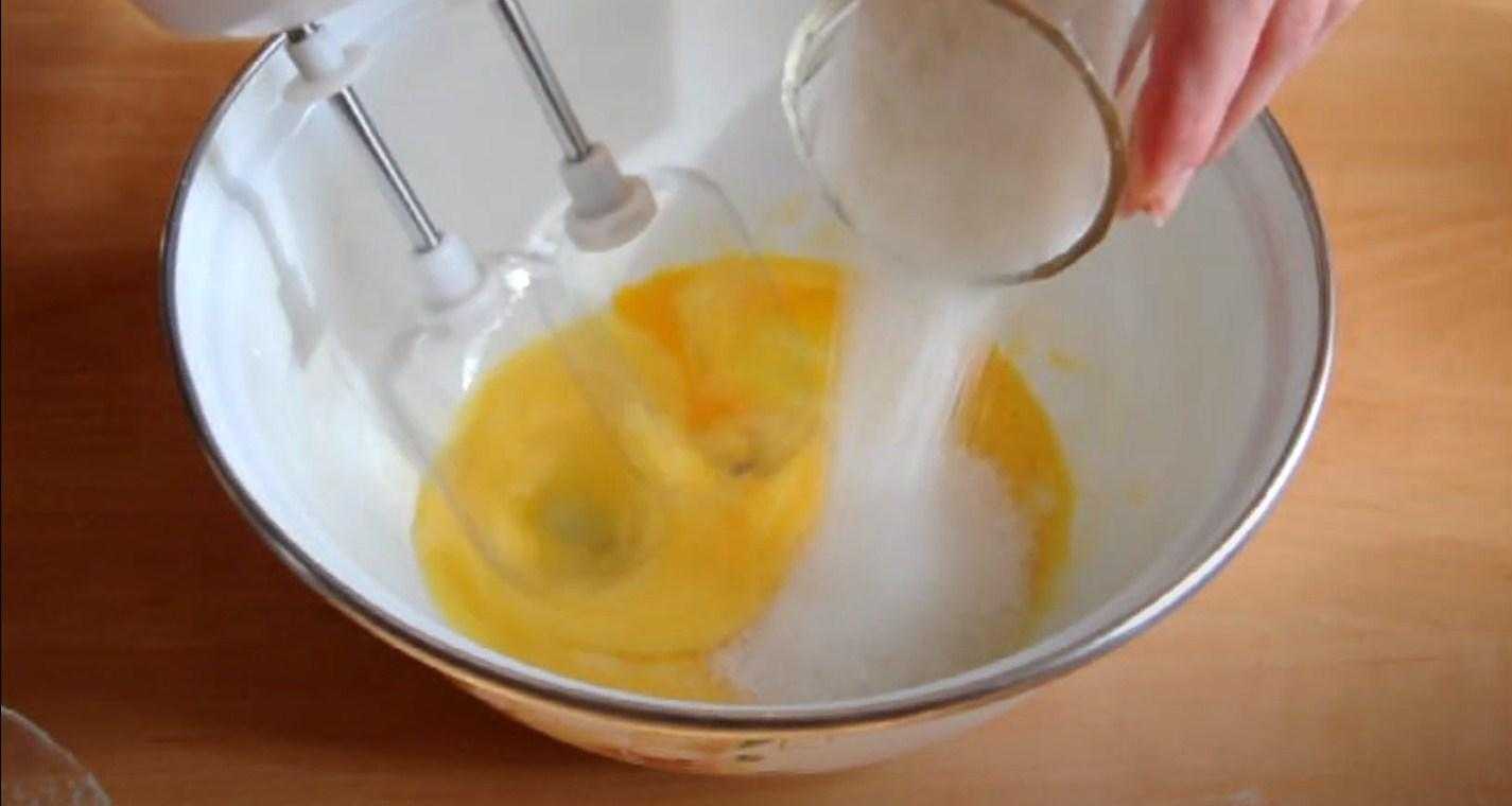 - Подсыпаем постепенно к взбитым яйцам 185 грамм сахара и взбиваем. Стараемся, чтобы крупинки максимально растворились.