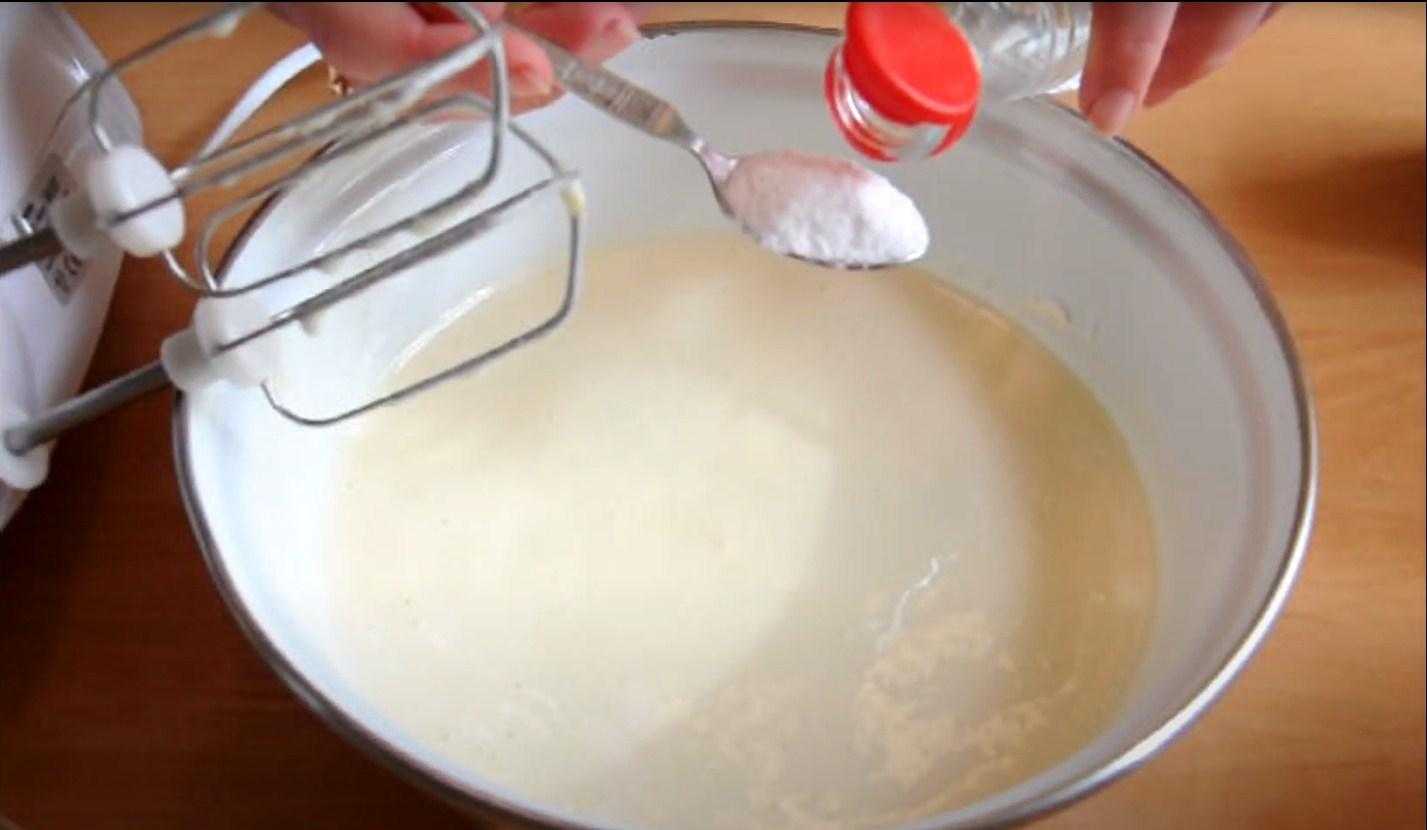 - Гасим 15 миллилитрами уксуса 11 грамм соды и вливаем в тесто. Очень тщательно размешиваем полученную смесь.