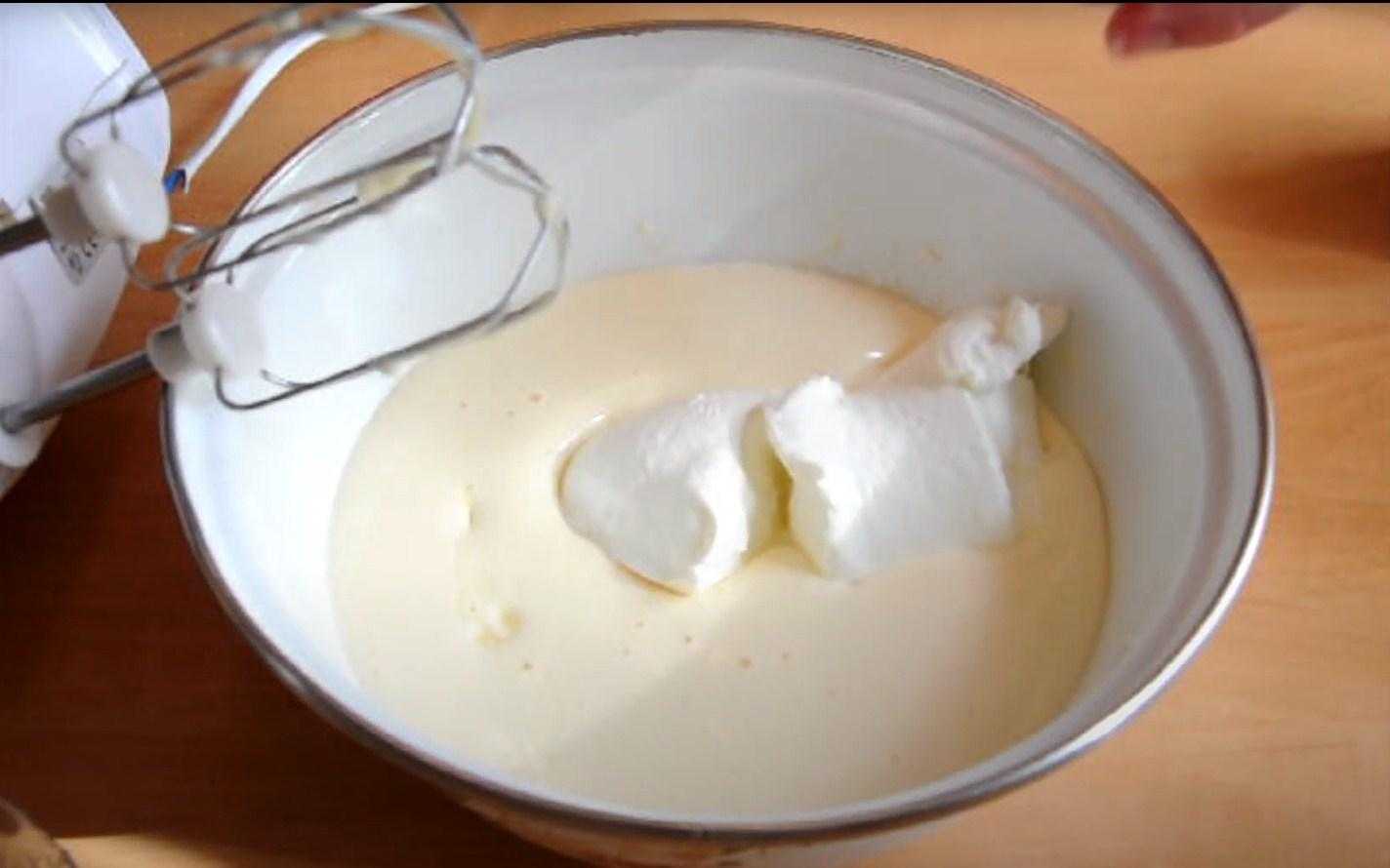- Взбейте сливки с оставшимся сахаром, и влейте в них крем. Хорошо перемешайте.