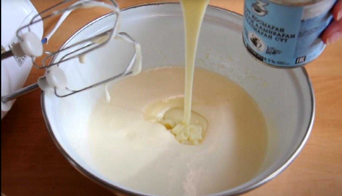 Затем добавляем сюда сгущенку и снова взбиваем, чтобы она равномерно распределилась в яичной пене. Теперь таким же образом вмешиваем сюда сметану.