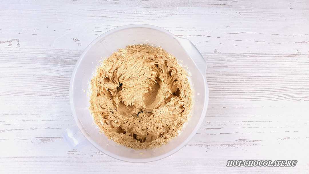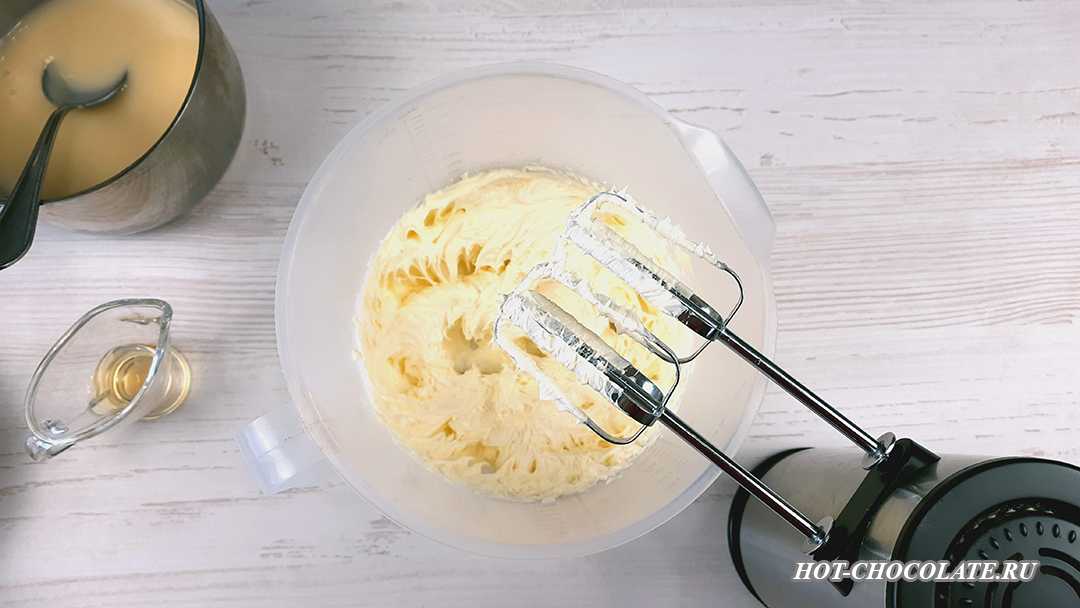 Важно! Масло должно быть комнатной температуры. Сначала взбиваем масло на низких оборотах. Когда масло посветлеет и станет более воздушным, буквально по одной ложке начинаем добавлять заварную основу