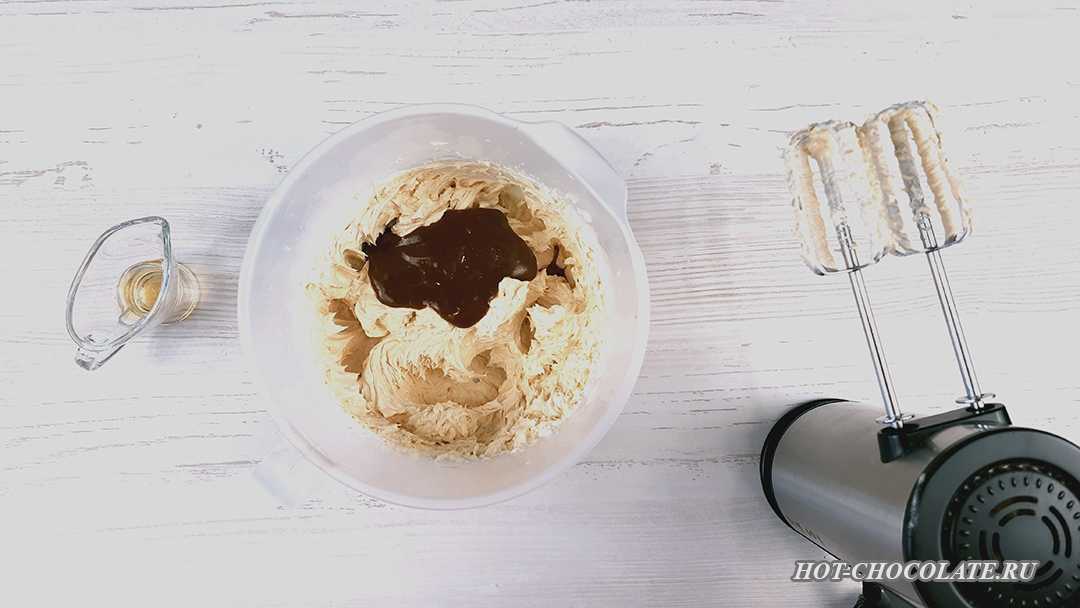 4. Растопленному шоколаду даём остыть, после чего добавляем его в масляный крем и взбиваем.