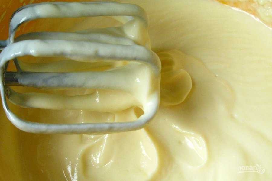 - Яичные желтки отделите от белков и перетрите с сахаром блендером до бела. Добавьте сгущенку и еще раз перемешайте.