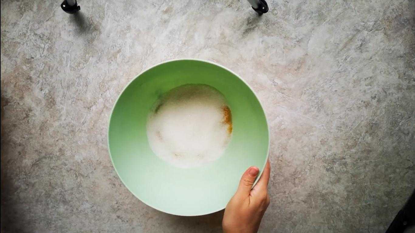 1. Соединить сырые яйца в миске с сахарным песком. Отдельно соединить муку с измельченной цедрой и разрыхлителем. Можно вместо цедры взять пакетик ванилина или ванильного сахара.