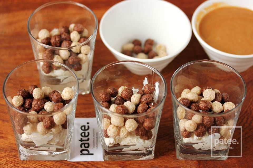 На слой из творожной массы в каждый стакан раскладываем шарики сухого завтрака.