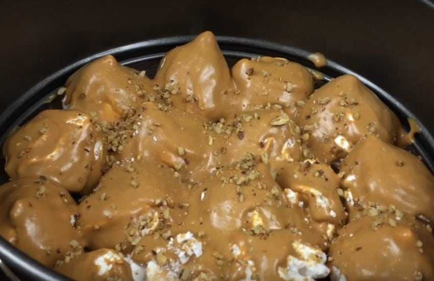 Теперь шарики каждой из четырёх порций десерта заливаем соусом из вареного и обычного сгущённого молока.