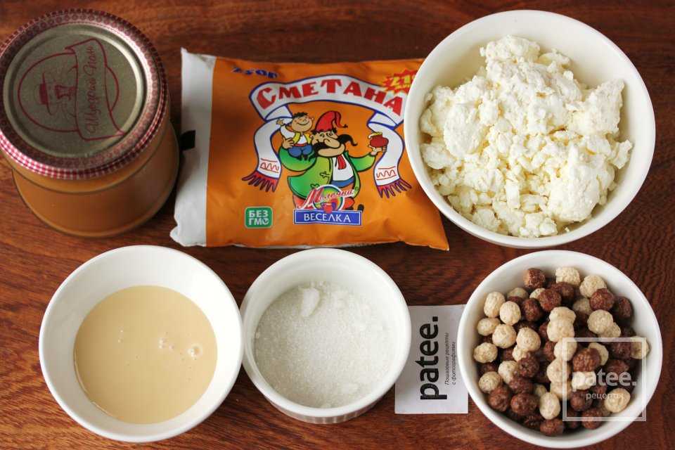 Для приготовления творожного десерта со сгущёнкой нам понадобятся следующие ингредиенты: творог, сметана 20% жирности и выше, сахар или сахарная пудра, вареное сгущённое молоко, шарики готового завтрака, обычное сгущённое молоко.