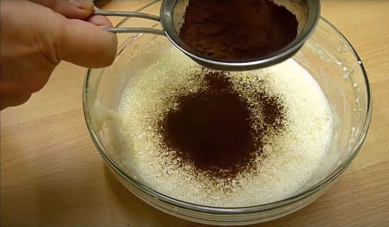 Добавляем какао. Его лучше просеять через мелкое сито, чтобы избежать образования комочков. Тщательно перемешиваем: сначала ложкой, затем миксером.