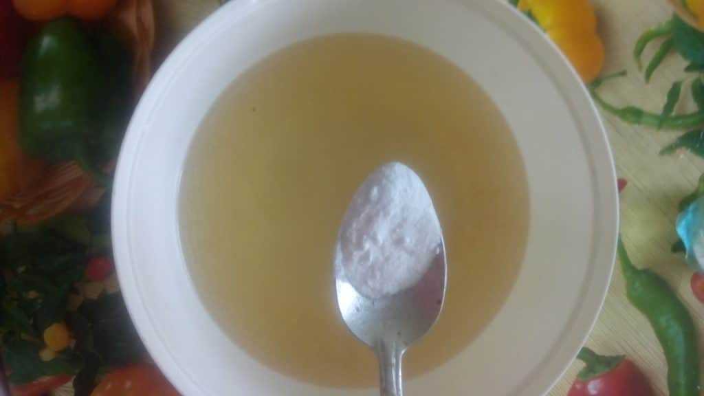- Насыщенный раствор процедить в стакан, затем вылить в глубокую миску и прибавить соду.