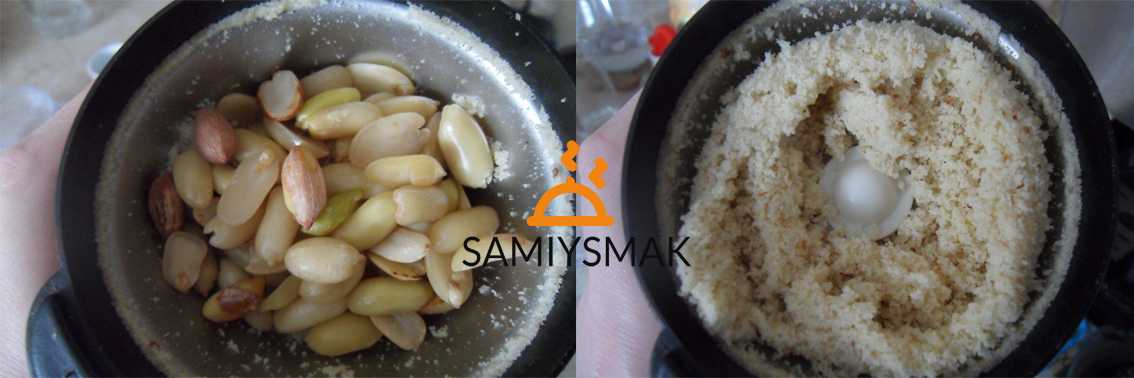 Перемелите орехи в кашицу с помощью кофемолки. В арахисе много масла, поэтому муки из него не получится. Именно маслянистая кашица, на вид очень приятная.