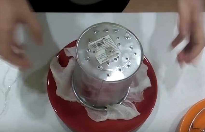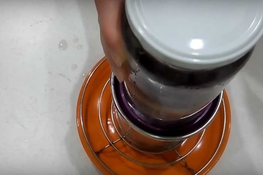 Теперь нужно поместить сверху блюдце, и на него разместить груз. Я налила в литровую банку воду, и разместила сверху. Если у вас ведерко, которое вы использовали из-под майонеза, или томатной пасты, то поступаем точно также.