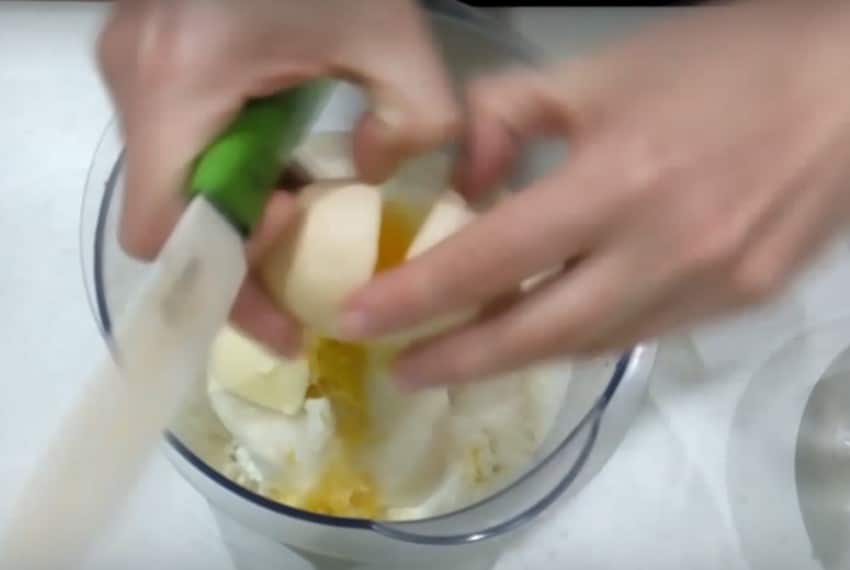 4.Творог перетрите блендером до мягкого состояния. Добавьте к нему размягченное подтаявшее сливочное масло и смешайте.