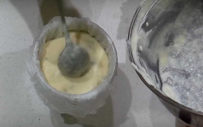 7.Вот и готово «тесто», которое не нужно запекать. Дальше действуйте, как и в предыдущих рецептах. Пасочницу застелите марлей, поставьте в емкость, выложите всю творожную основу, накройте ее и поставьте под гнет.