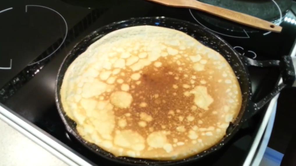 Жарим блин на одной стороне около 10-15 секунд (зависит от вашей плиты).