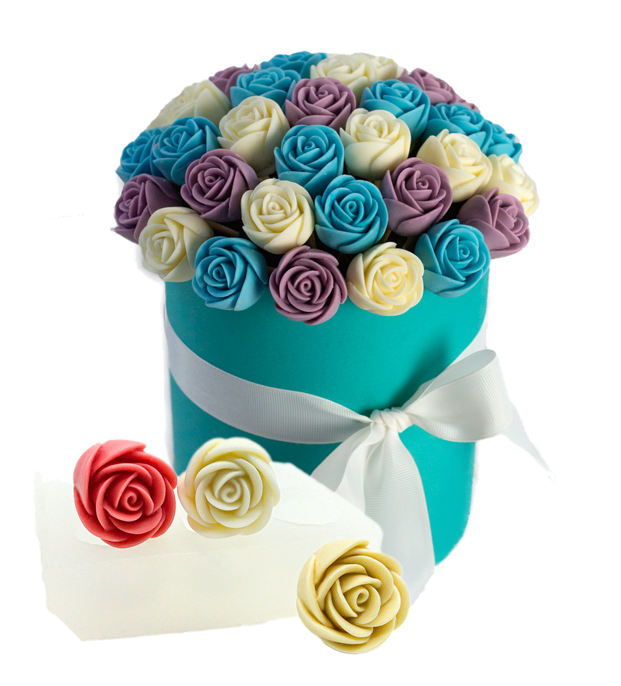 Силиконовые формы для заливки шоколада бывают разных размеров. Поэтому в композицию можно включать детали одного диаметра или разного. Это тоже привносит в декор корзины новые нотки.