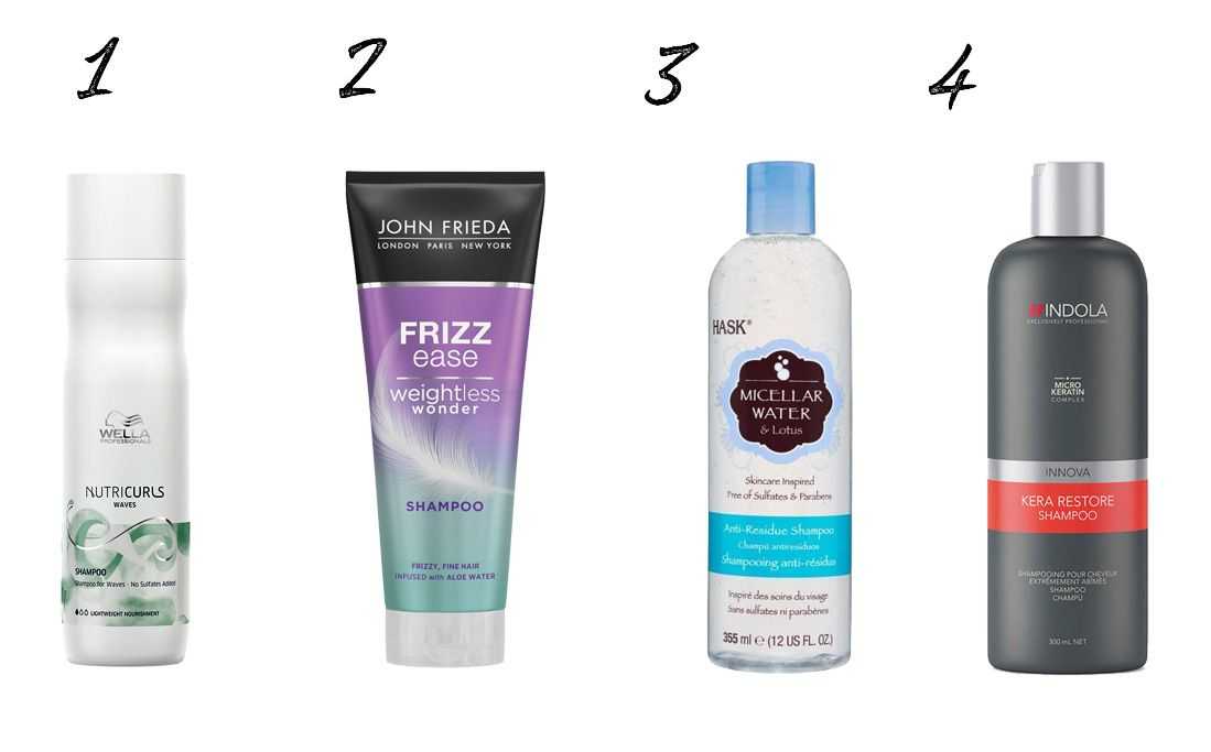 1 — шампунь для вьющихся волос Wella Professionals, 2 — шампунь для придания гладкости и дисциплины тонким волосам John Frieda, 3 — шампунь для глубокого очищения волос с мицеллярной водой и экстрактом лотоса Hask, 4 — шампунь для волос кератиновое восстановление Indola