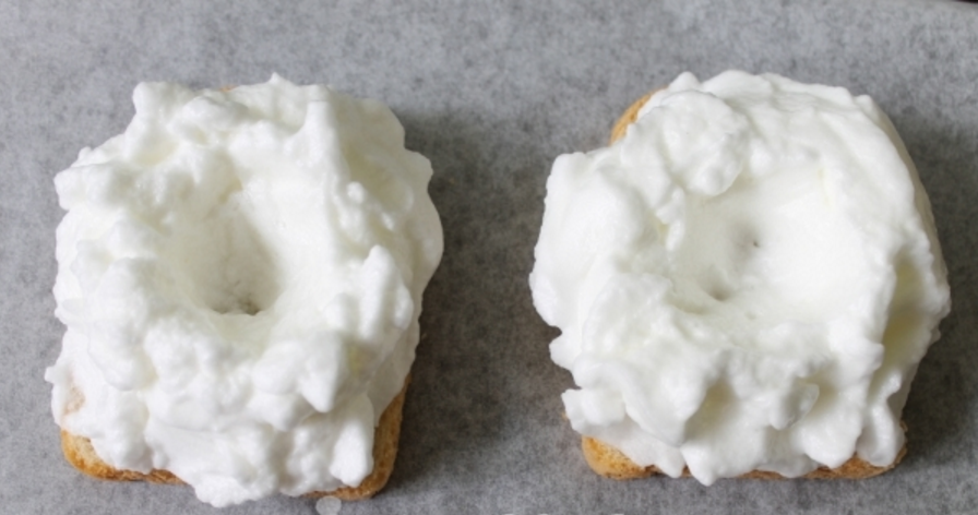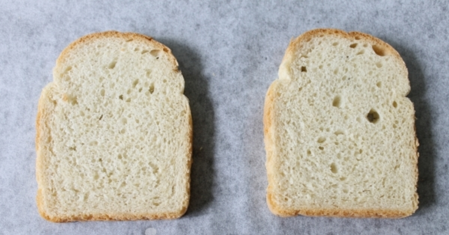 - Багет нарезаем ломтиками по 1,5 см, извлекаем часть мякоти из серединок (оставляя по всей окружности ломтиков по 1,5 см), выкладываем мякоть в приготовленную емкость.