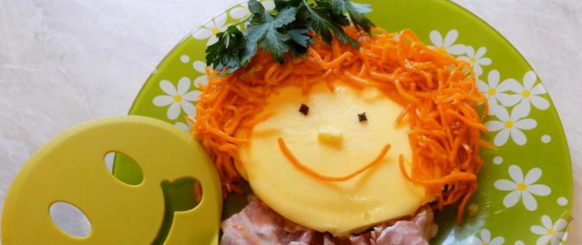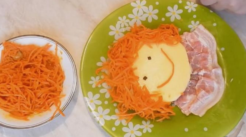 Украсить. Воротник из бекона, волосы из корейской морковки, глаза — перчинки или гвоздика.