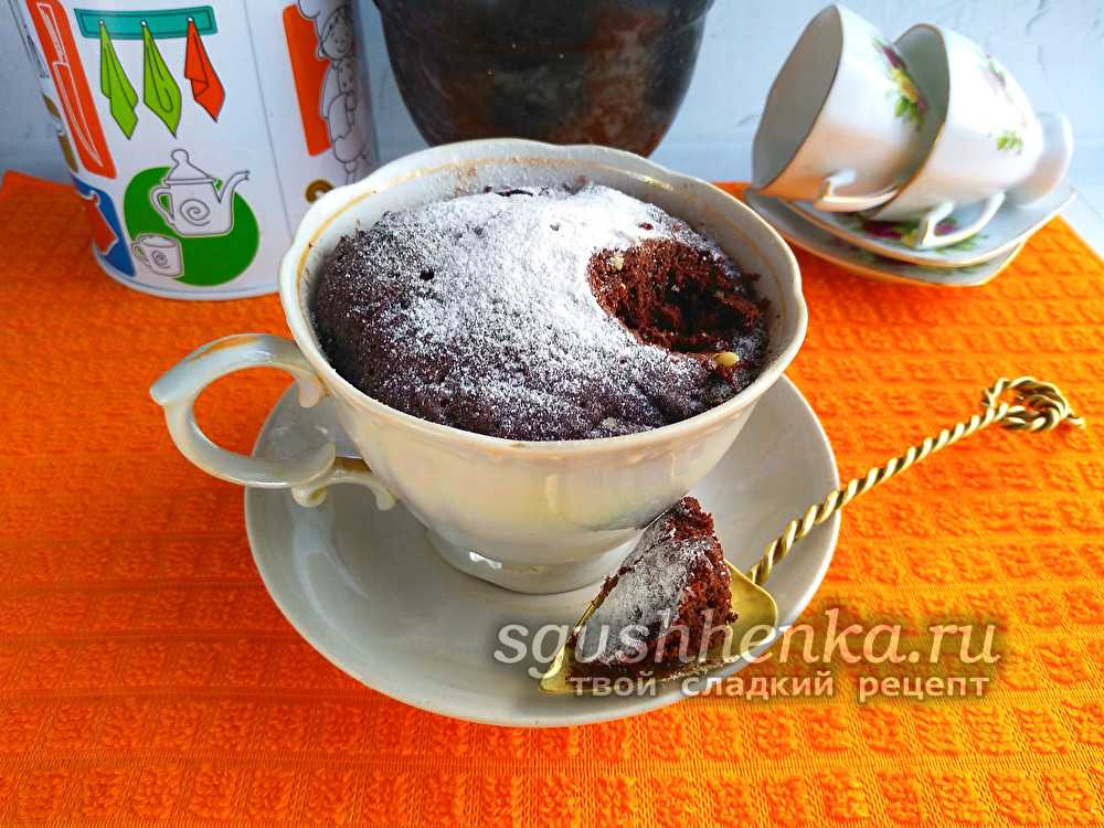 Готовый десерт покройте сверху измельченными орехами, дополнительно можете посыпать сахарной пудрой. Аналогичную сладость можно приготовить в духовке в режиме для запекания, например, если требуется приготовить шоколадное лакомство одновременно на несколько персон.