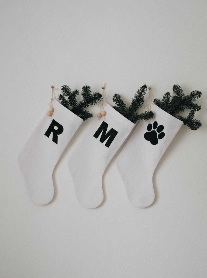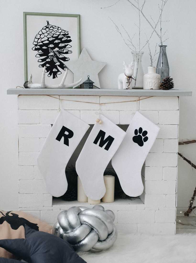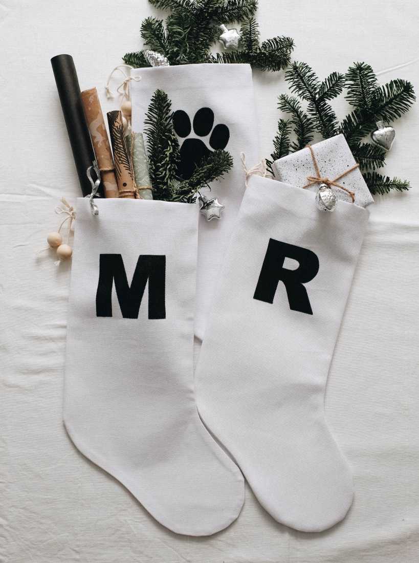 Я решила сделать рождественские носочки монохромными, поэтому выбрала для них белую ткань и нанесла первые буквы наших с мужем имен черной краской по ткани. Вы можете отталкиваться от своего интерьера и выполнить их в любом цвете.