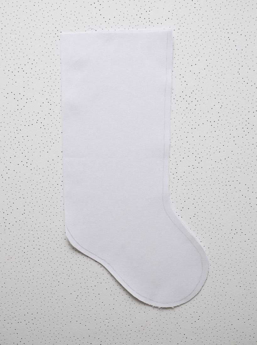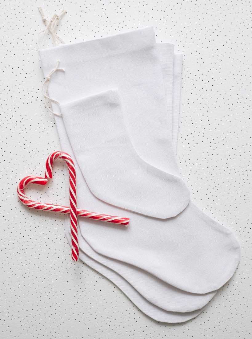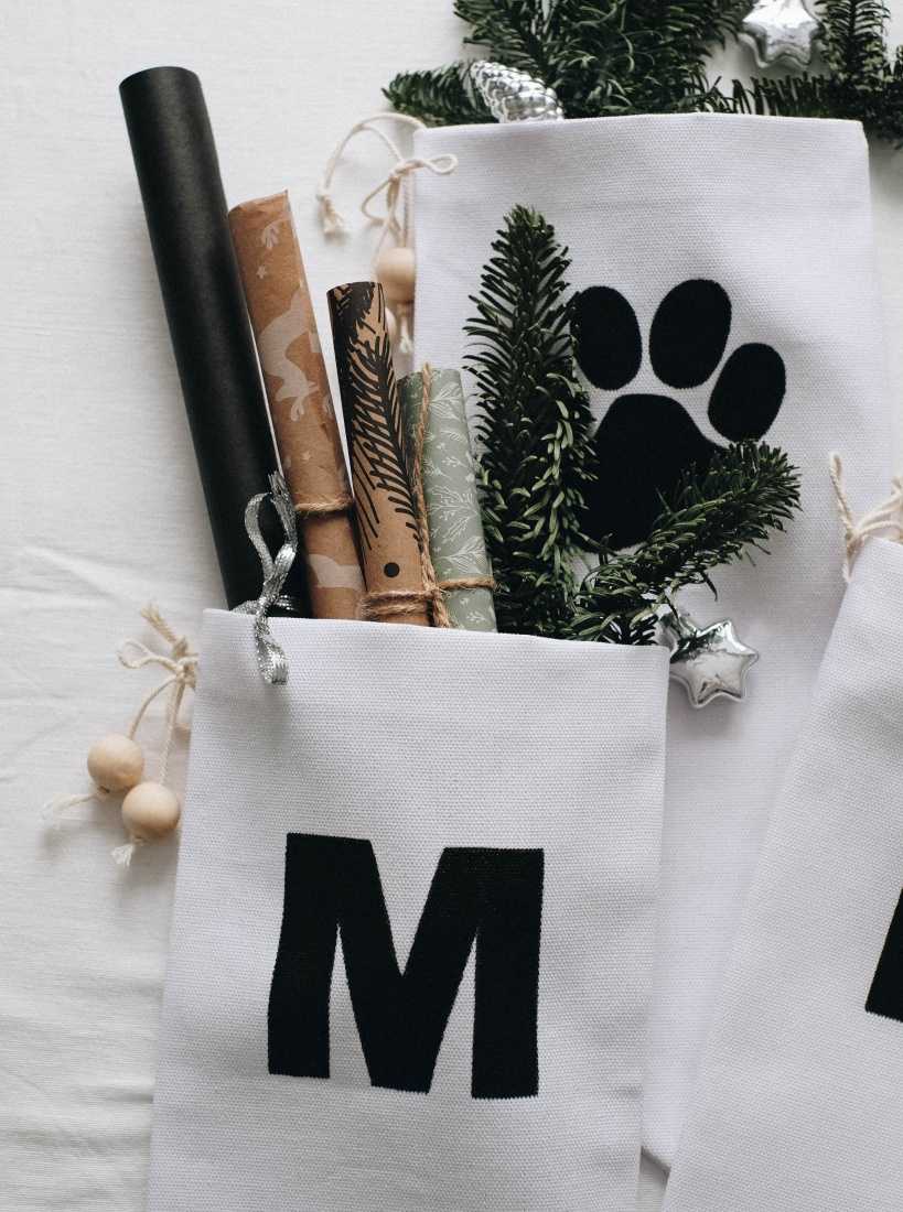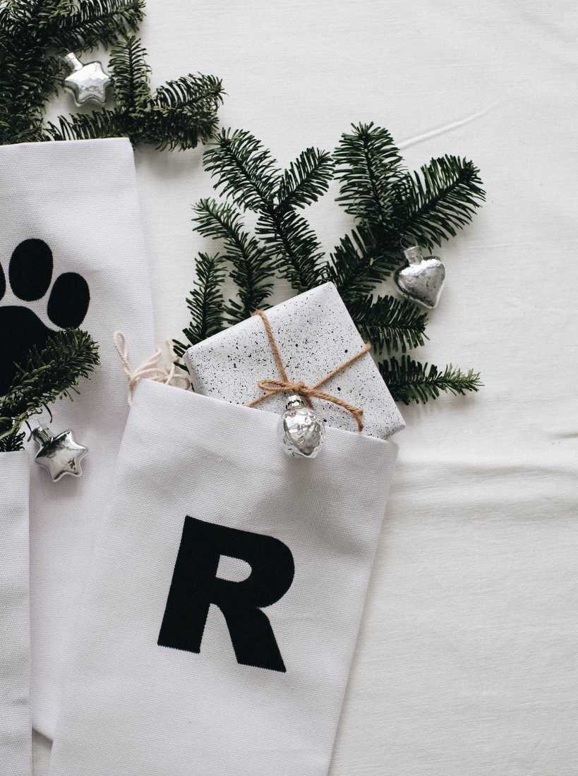 Я решила сделать рождественские носочки монохромными, поэтому выбрала для них белую ткань и нанесла первые буквы наших с мужем имен черной краской по ткани. Вы можете отталкиваться от своего интерьера и выполнить их в любом цвете.