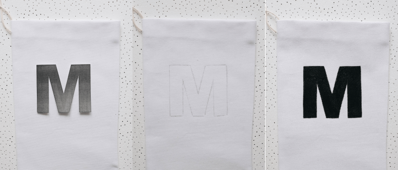 Прикладываем букву к ткани, обводим простым карандашом и раскрашиваем акрилом для текстиля.