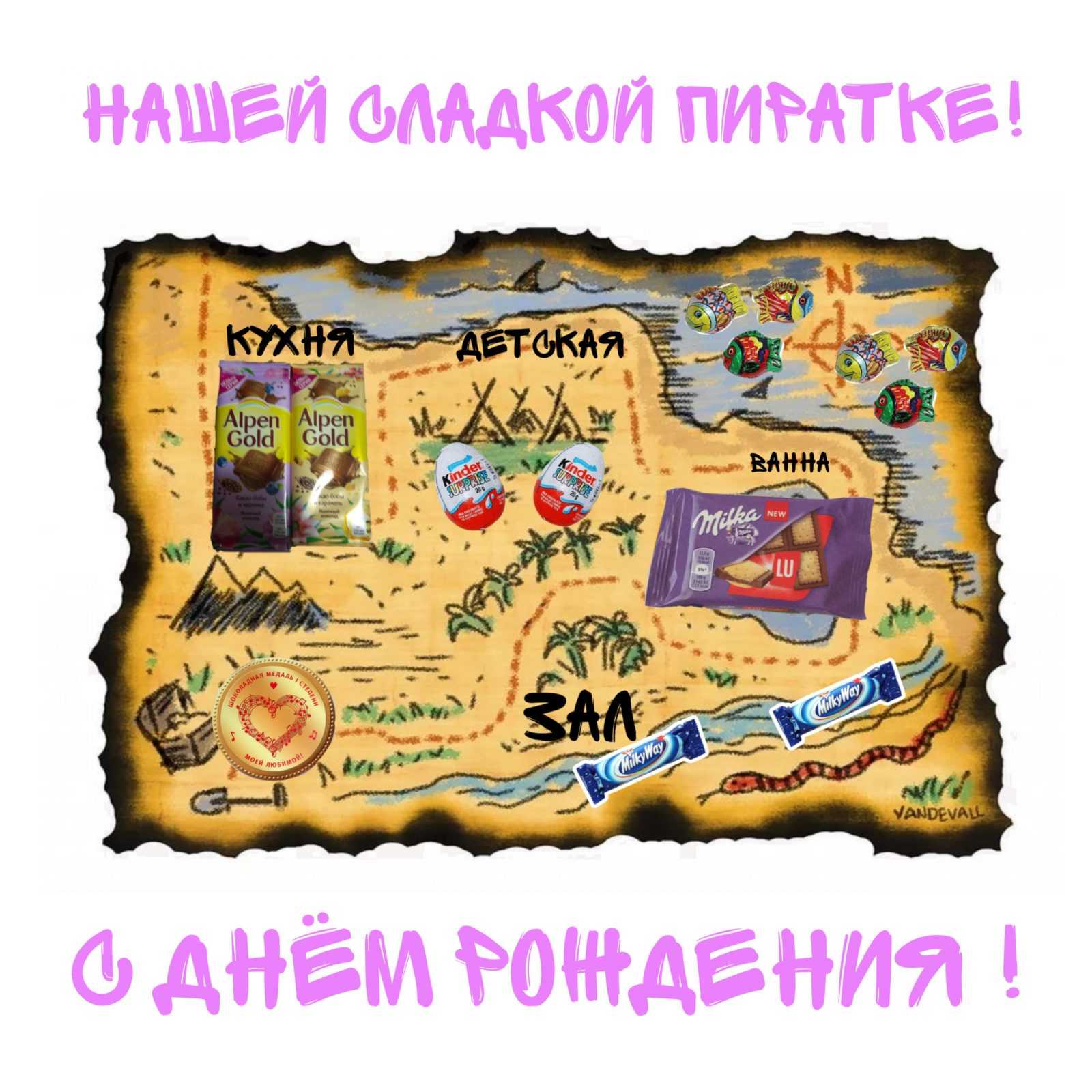Отличная идея создать на плакате карту сокровищ с загадками и метками из сладостей.