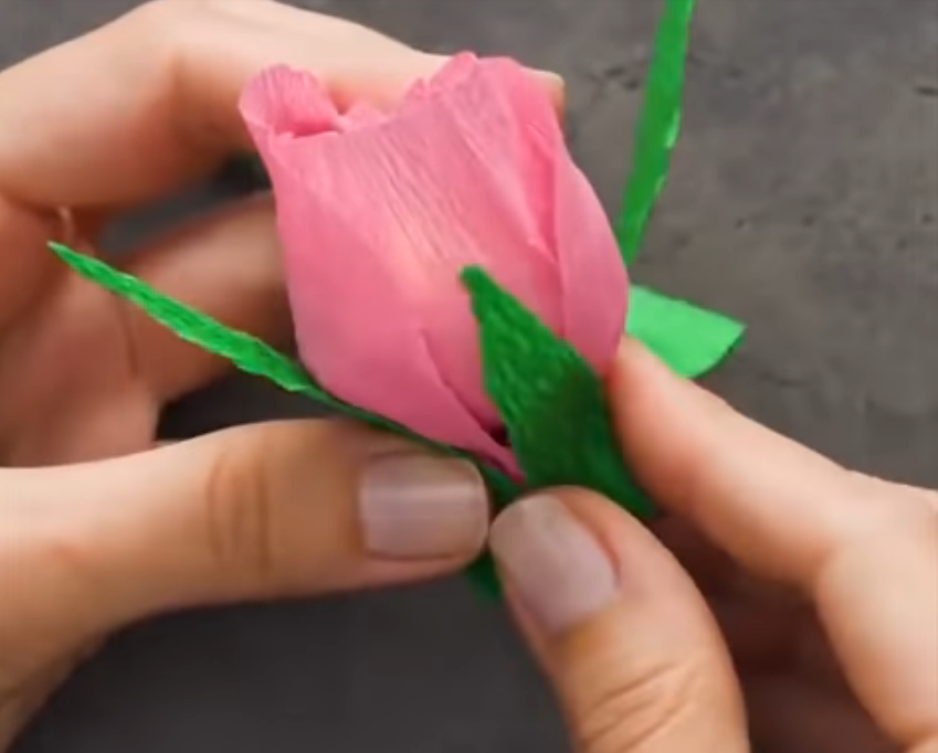 Зеленой лентой, тонкой полоской из гофрированной бумаги или зеленой нитью обернуть несколько раз основание бутона, создавая чашелистик.