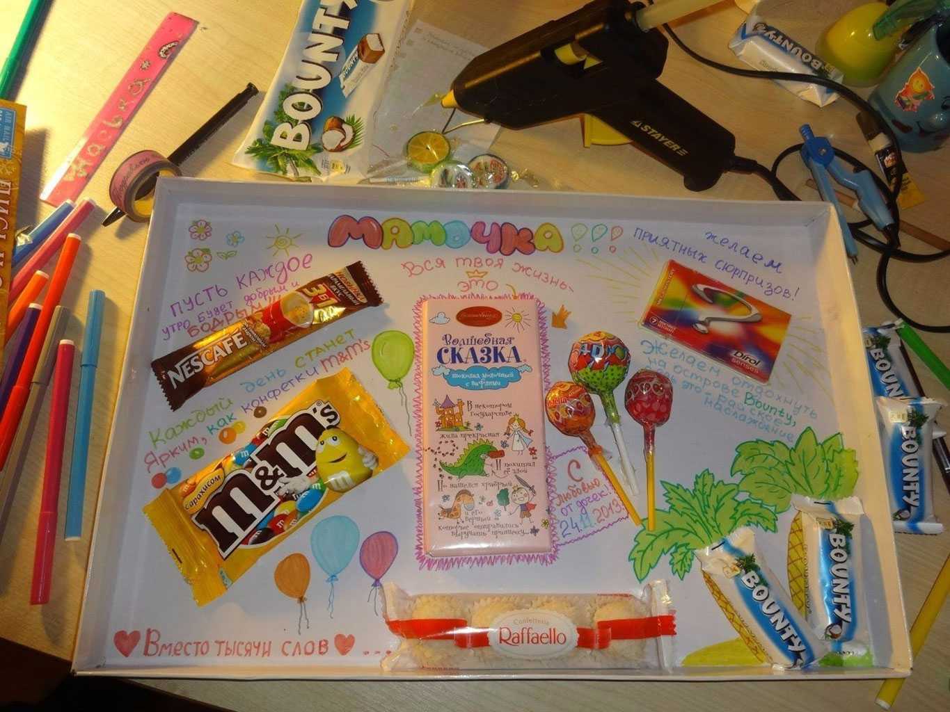 Подарок в виде коллажа с конфетами можно сделать своими руками. Он должен быть ярким и необычным: оформляют разными видами шоколада и другими вкусностями. Стоимость такого презента небольшая, в сравнении с вариантами, которые можно приобрести в сувенирных магазинах. Создание плаката с оригинальными надписями станет хорошим решением для того, чтобы выразить свои чувства другу или подруге.
