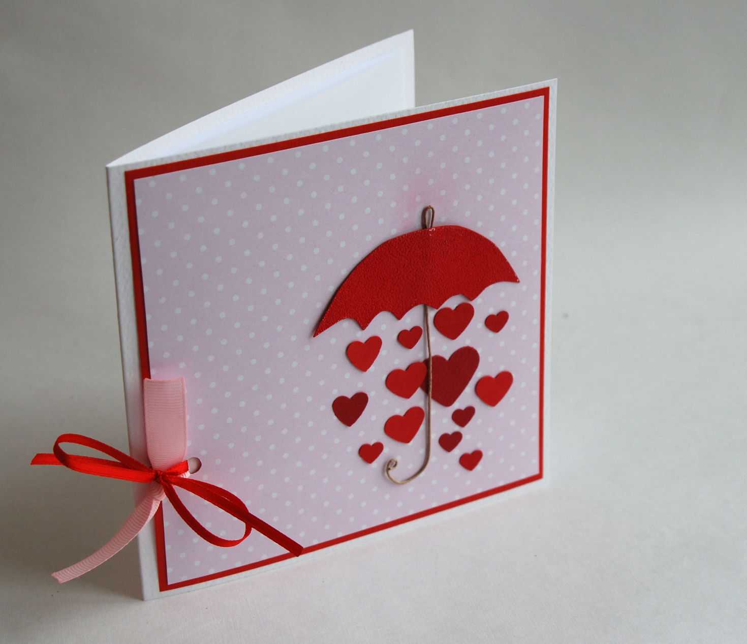 Ну а саму открытку делать легко: возьмите основу из любого цвета бумаги, согните пополам. Далее из другого листа бумаги вырежьте сердце и приложите к презенту. При помощи штампа заполняем форму, даем высохнуть, внутри пишем признания.